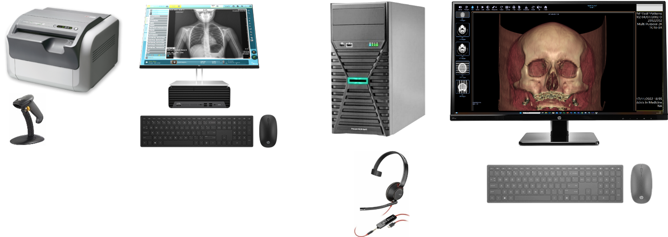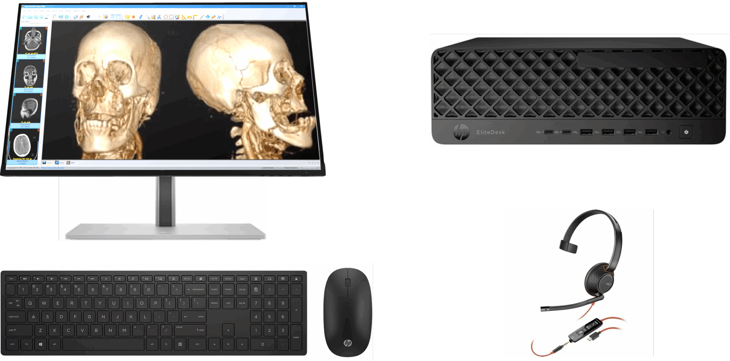 ● Based on HP Elite 8 SFF G1i ● Processor Intel Core Ultra 7 ● Storage 16GB SDRAM & 512 GB SSD ● Graphic Controller Intel UHD Graphics 770 ● Operating System Windows 11 Pro – 64 bit ● Monitor HP Serie 7 Pro 727pu 27" WQHD LED - 4MP 16:9 ● Radiant 3D/MPR DICOM viewer & CRCB-PACS standard DICOM viewer ● Microsoft Office 2024 with permanent license ● Headset POLY Blackwire 5210 for report fuction