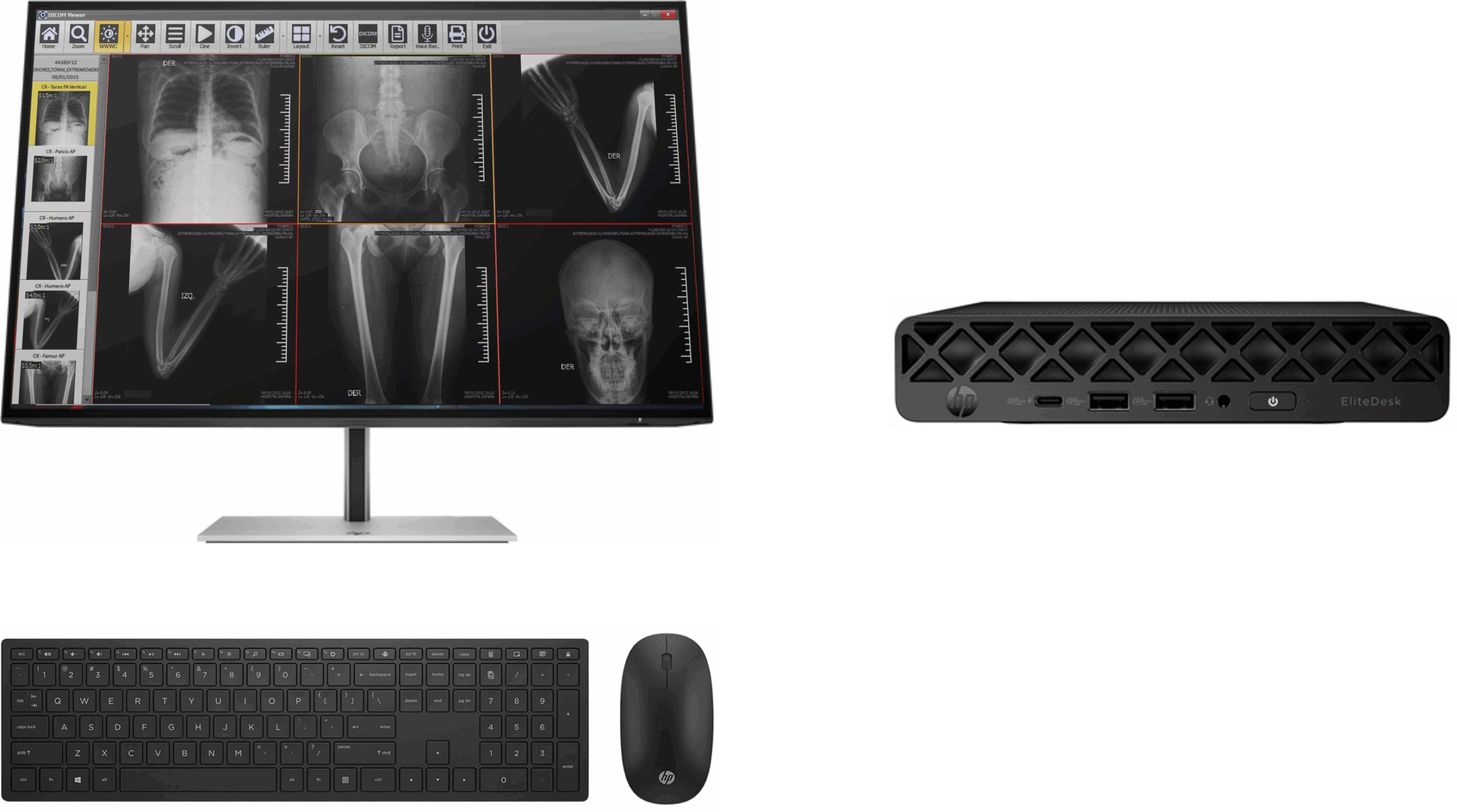 ● Based on HP EliteDesk 8 Mini G1i ● Processor Intel Core Ultra 7 ● Storage 16GB SDRAM & 512 GB SSD ● Graphic Controller Intel UHD Graphics 770 ● Operating System Windows 11 Pro – 64 bit ● Monitor HP Serie 7 Pro 24" WUXGA USB-C 2MP - 2K HD ● CRCB-PACS standard DICOM viewer