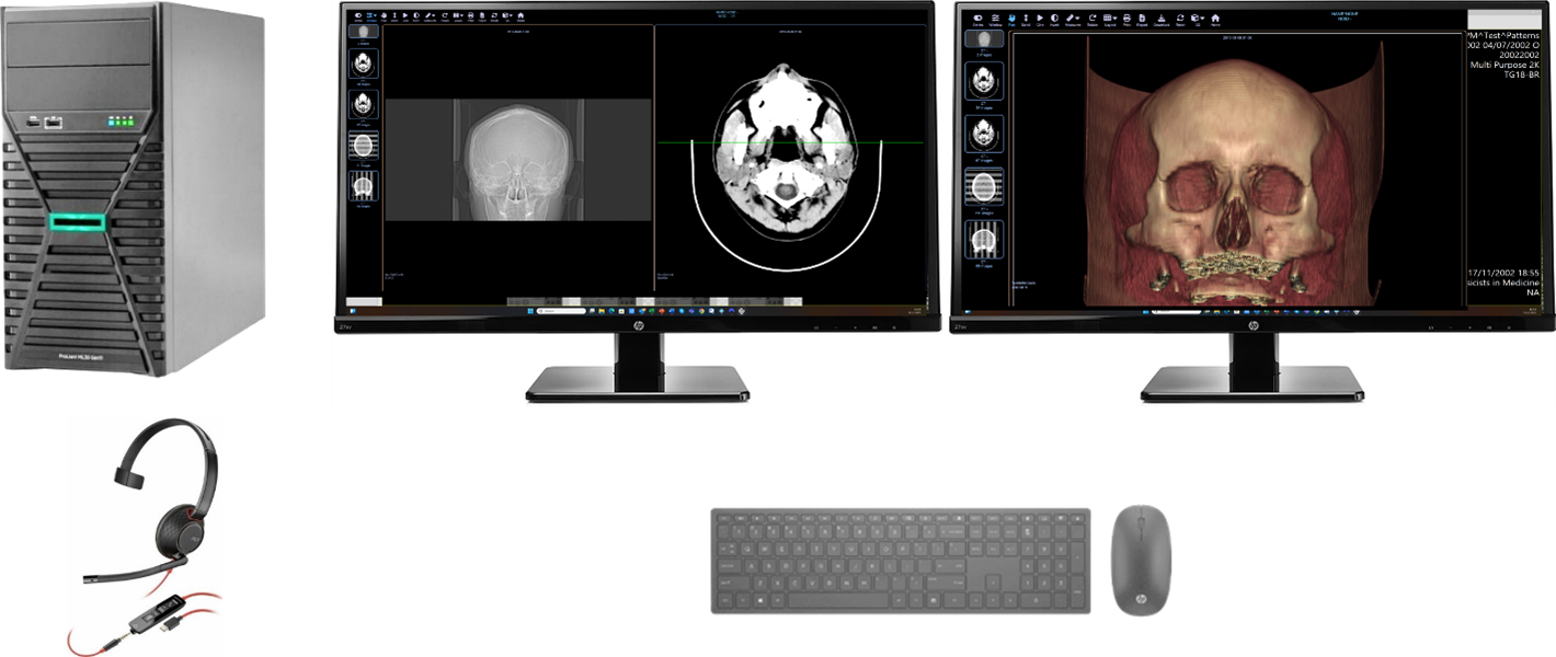 → All-in-one Powerhouse: ● PACS server with integrated High-End Viewing Workstation ● Two times HQ 27” monitor ● Ergonomic Keyboard & Mouse ● Headset for reporting